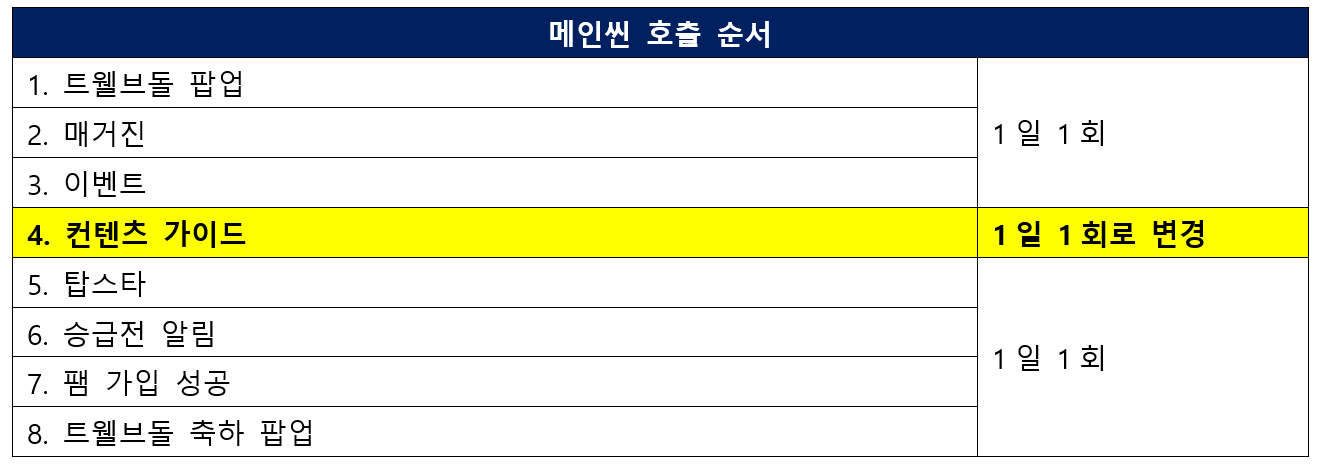2) 위 표와 같이 메인 화면 진입 시 호출되는 컨텐츠는 1일 1회로 진행되게 됩니다.