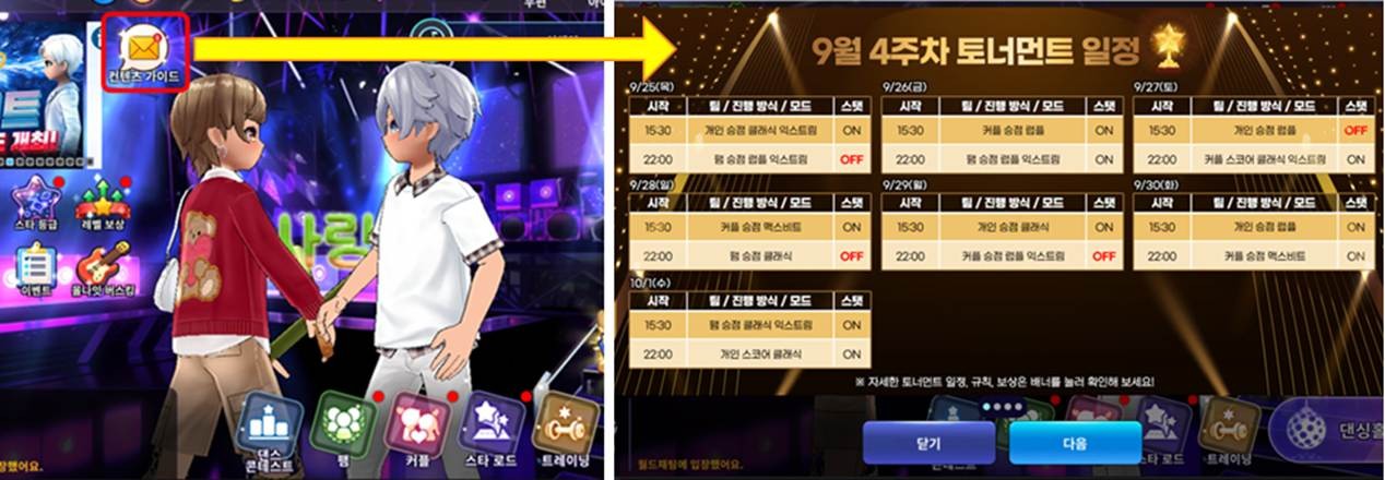 2) 컨텐츠 가이드 팝업에서 토너먼트 일정을 확인할 수 있습니다.