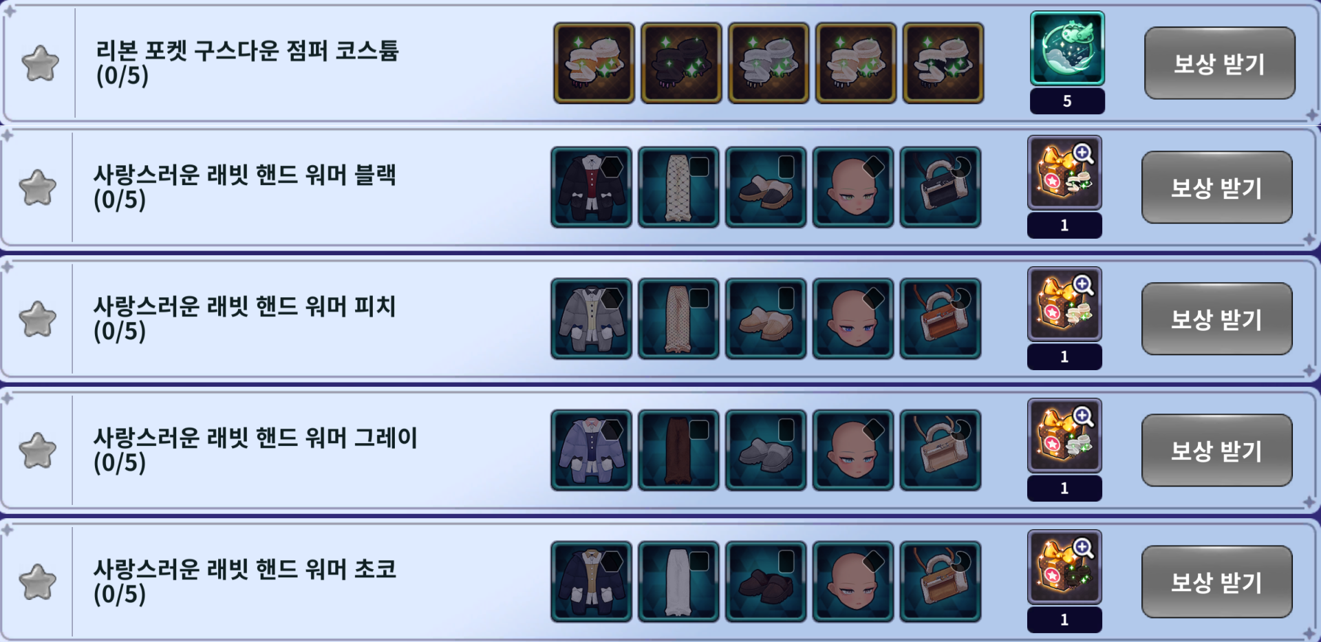 | 사랑스러운 래빗 핸드 워머 초코 | 미드나잇 리본 포켓 구스다운 점퍼 블랭크 플리스 팬츠 초코 어그 블로퍼 한겨울 살짝 울적한 페이스 살짝 열린 플러피 사첼백 탠 | 미드나잇 리본 포켓 구스다운 점퍼 수집 보상 박스 (보상 : 사랑스러운 래빗 핸드 워머 초코) |