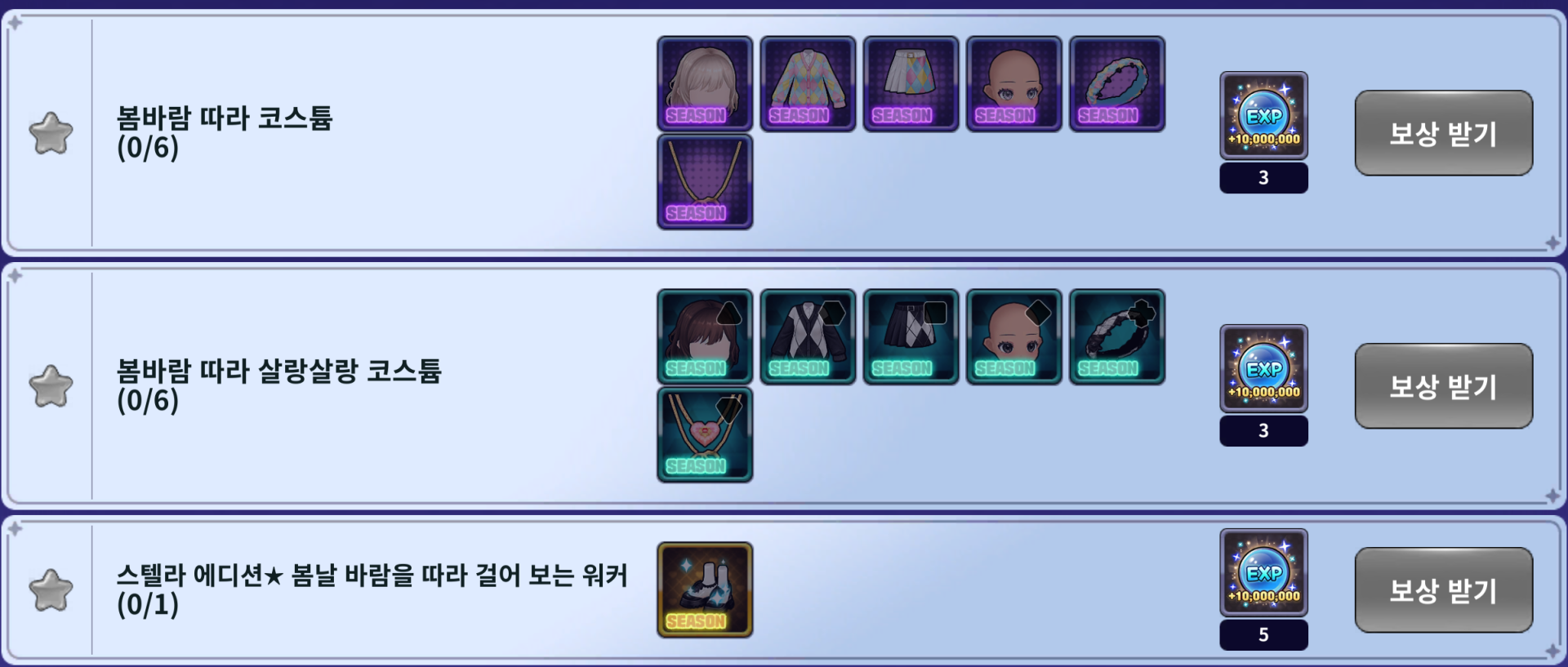 | 22 | 봄바람 따라 헤어악세 박스 1개 | 봄바람 따라 살랑살랑 헤어악세 박스 1개 | 럭셔리 럽스페이스 배지 3,000개 |