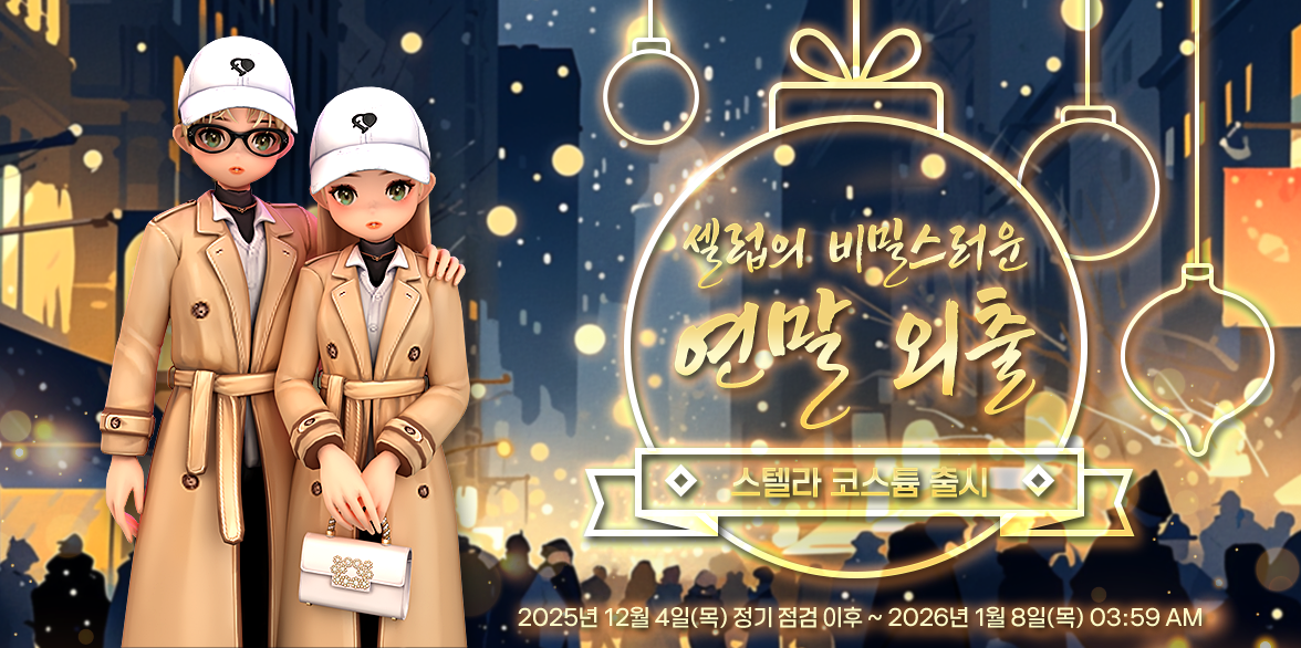 📌 스텔라 패스 시즌 레벨을 올리고 신규 스텔라 코스튬 [셀럽의 비밀스러운 연말 외출] 세트를 모두 모아보세요!