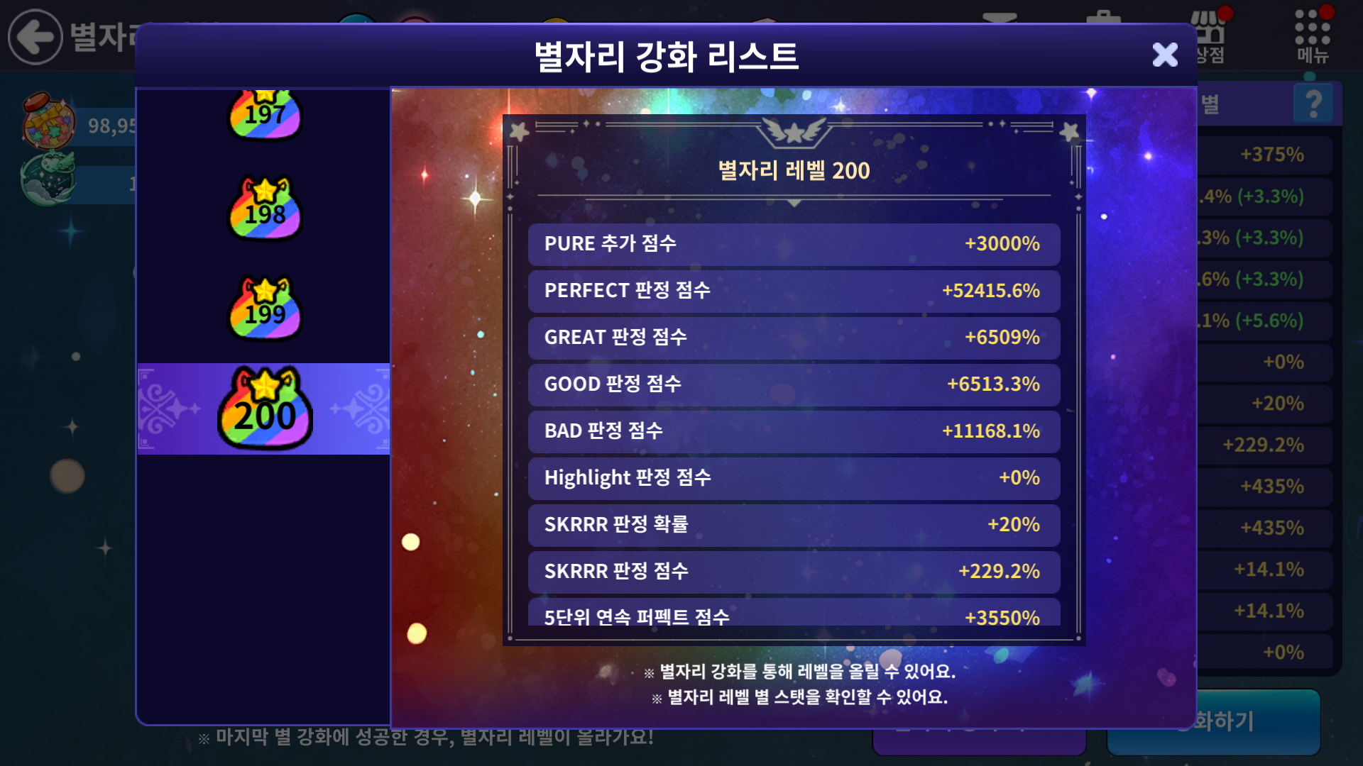 | 12 | PURE 추가 점수 +0.1% | PURE 추가 점수 +0.8% SKRRR 판정 점수 +6% 5단위 연속 퍼펙트 점수 +6% COMBO 추가 점수 +6% |