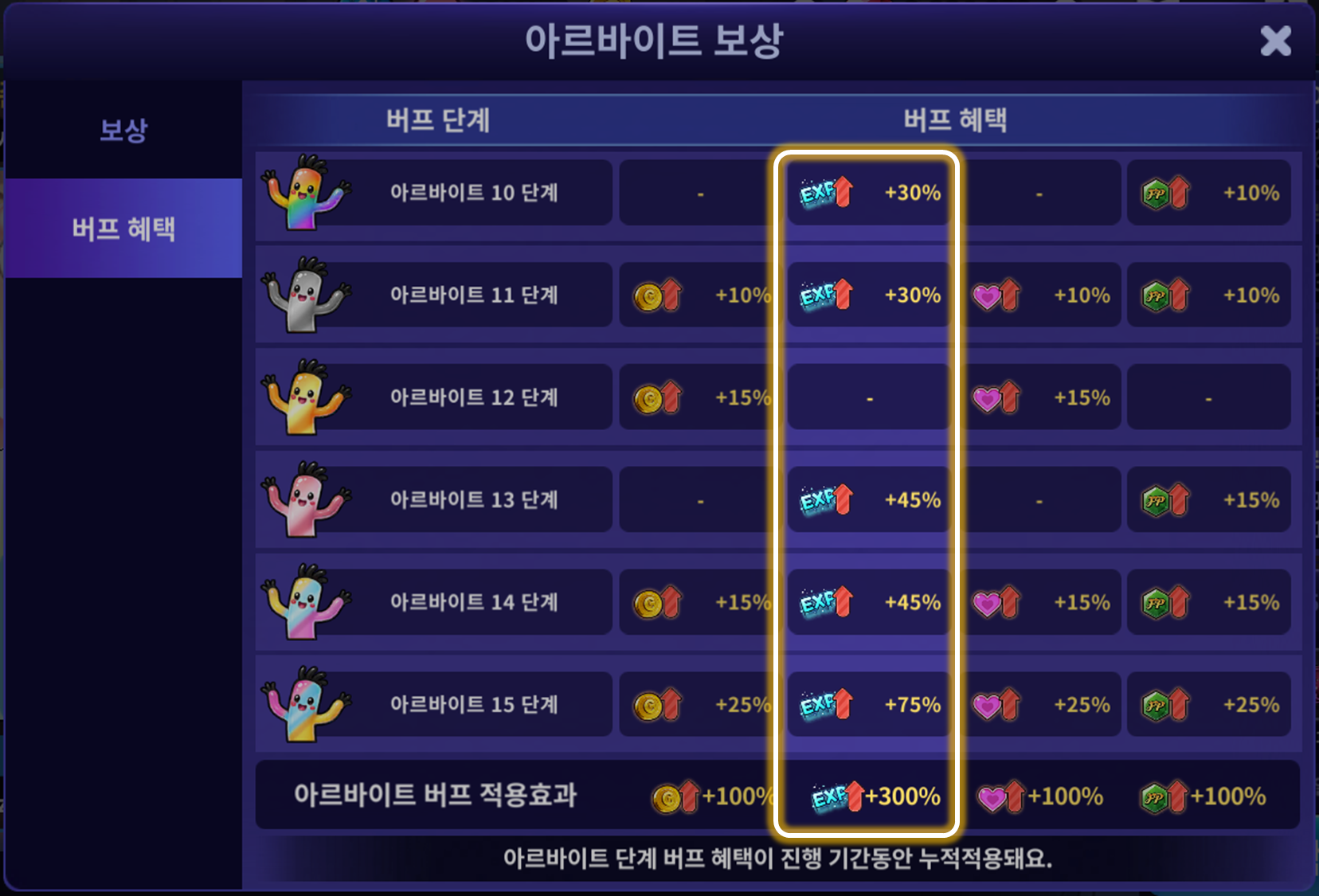 🌟아르바이트 시즌 9 한정 이벤트 - 아르바이트 단계 별 경험치 버프 혜택이 기존 대비 3배로 증가합니다.