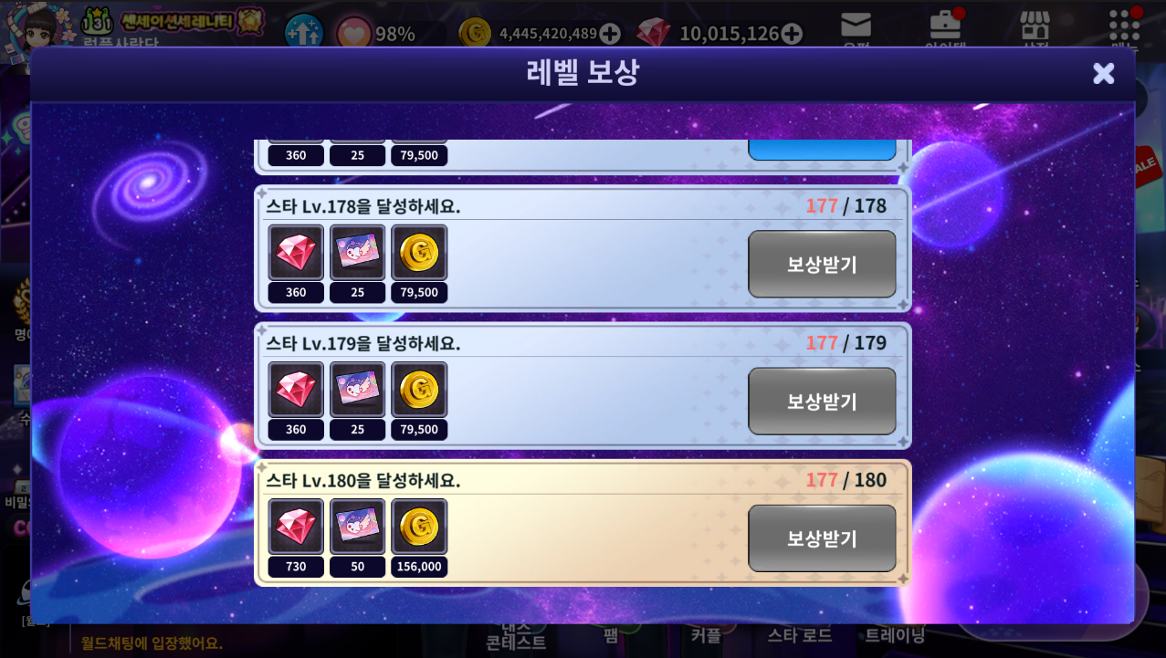 | 성장 | EXP 획득 별사탕 제작 | EXP 획득 [유지] 별사탕 제작(골드 상자) [삭제] 별사탕 제작(루비 상자) [유지] |