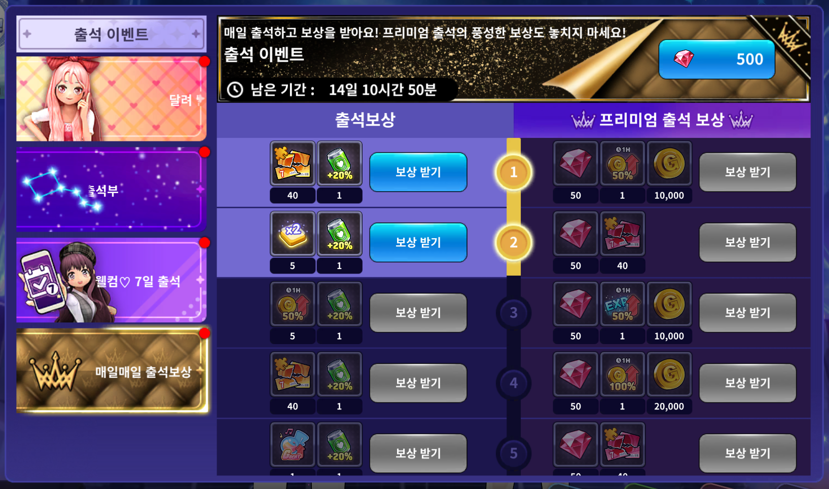 [메인화면] - [메뉴] - [출석부]를 클릭 후 [매일매일 출석보상]을 통해 확인할 수 있습니다.