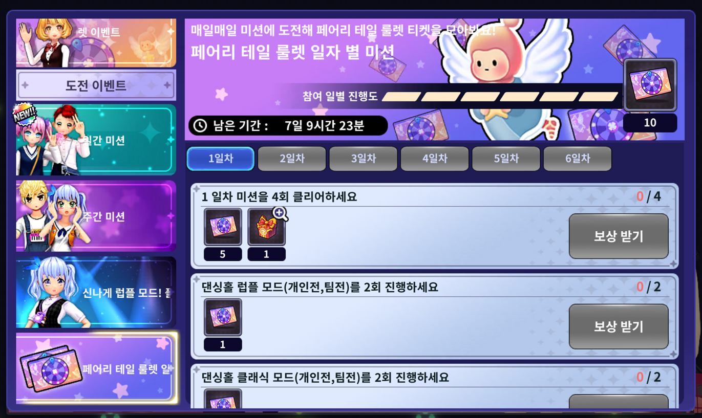 [메인화면] - [메뉴] - [이벤트] - [도전 이벤트] - [페어리 테일 룰렛 일자별 미션] 화면에서 일자별 미션을 달성하여 보상을 획득할 수 있습니다.