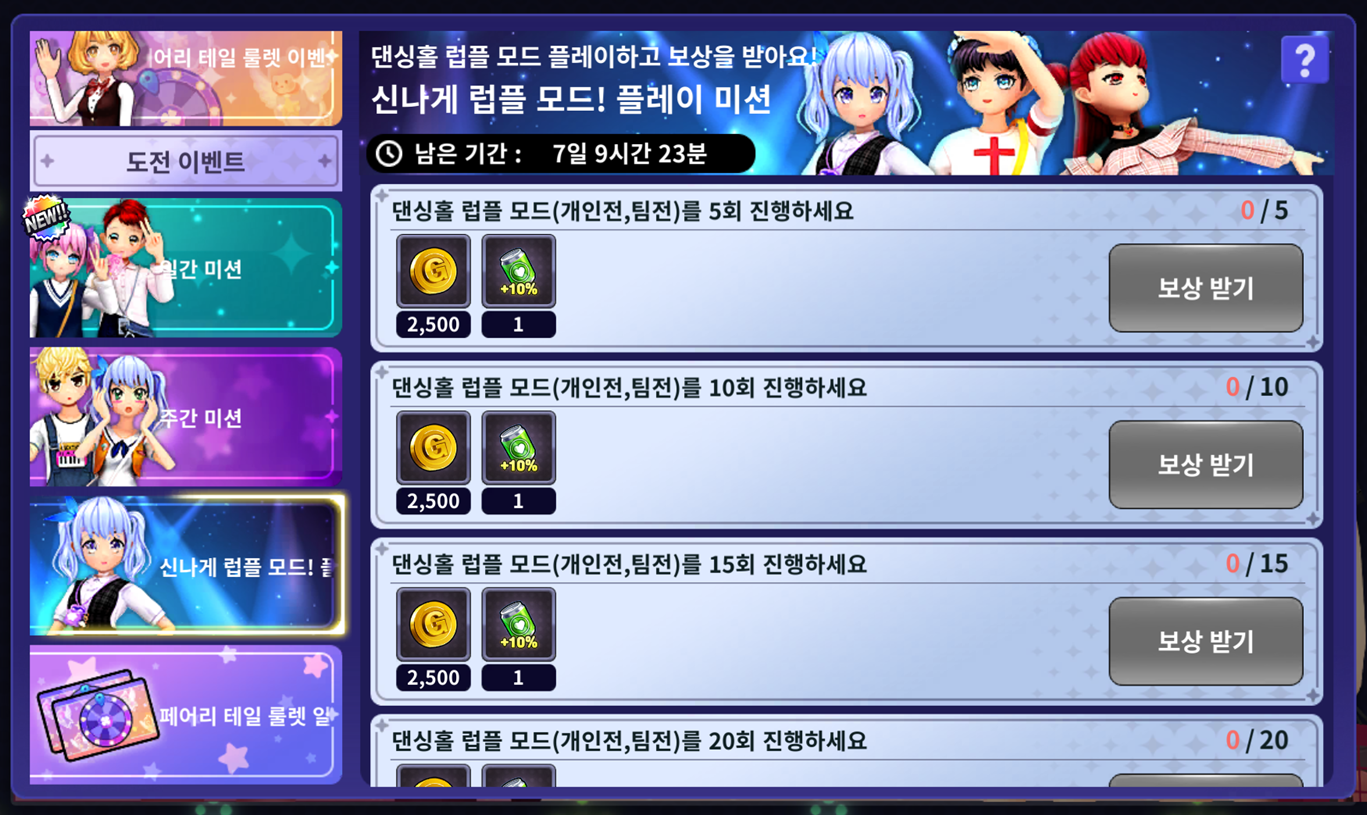 | 댄싱홀 럽플 모드(개인전, 팀전)를 5회 진행하세요 | 2,500 골드 | 컨디션 회복 드링크 10% 1개 |
