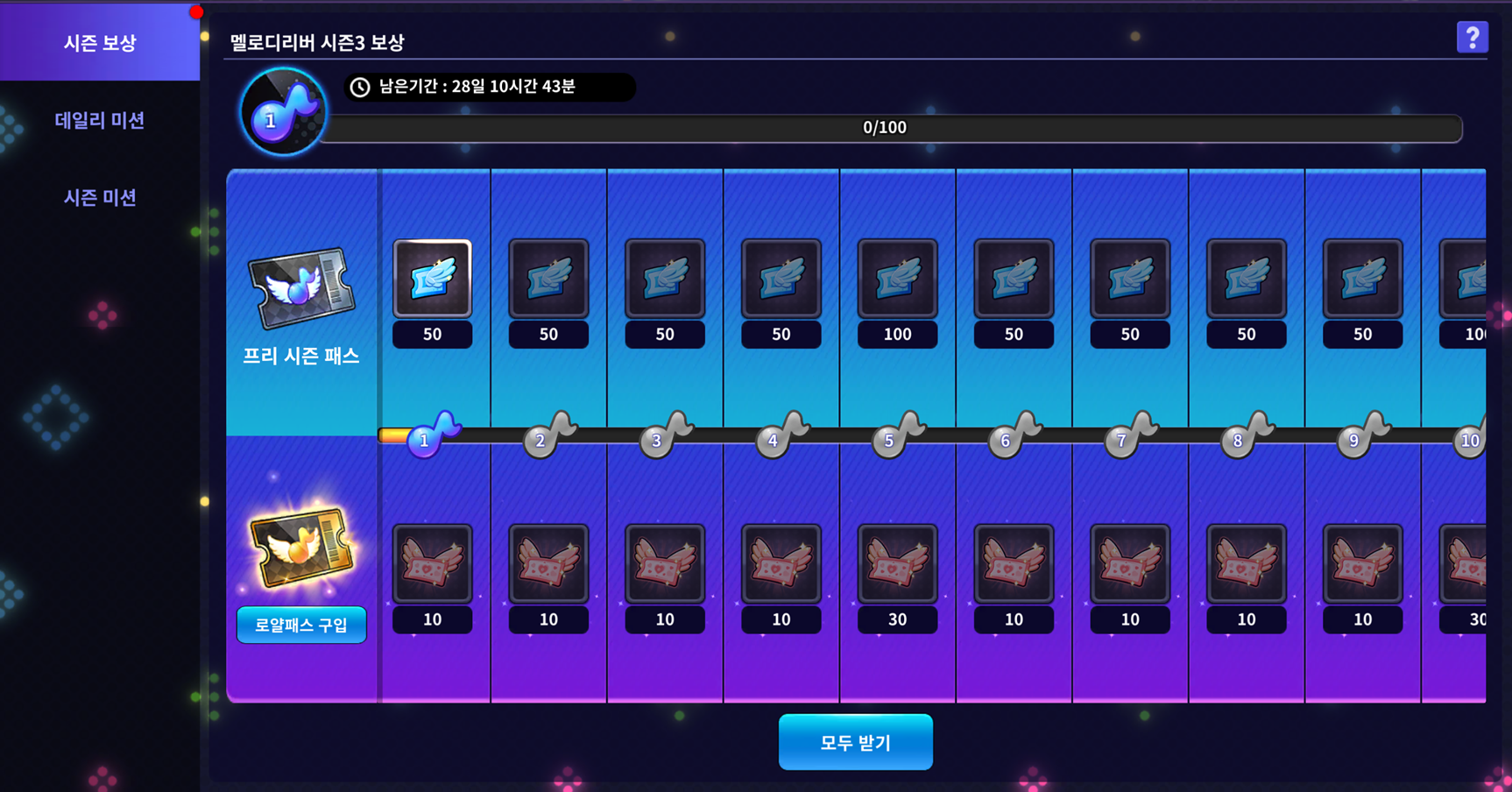 매일, 시즌 기간 동안 미션을 달성하면 패스 포인트가 쌓이고 패스 레벨이 오르게 됩니다.